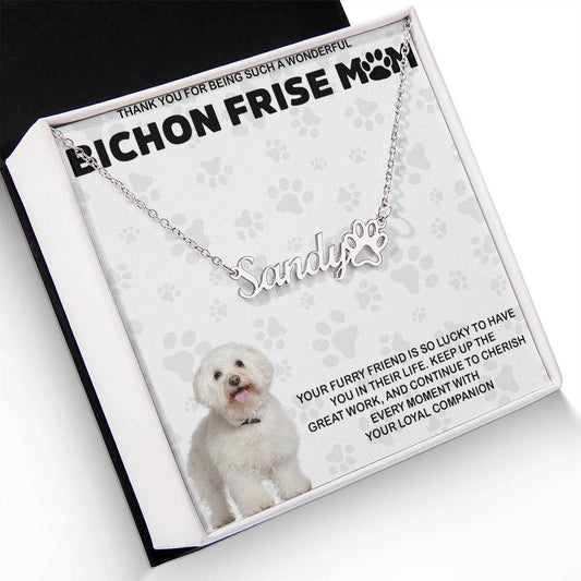 Personalized Bichon Frise Mom Paw Print Name Necklace - Customized Jewelry Gift for Women Bichon Frise Dog Lover